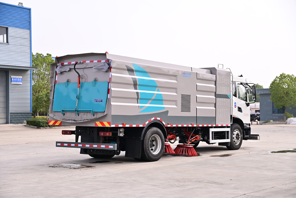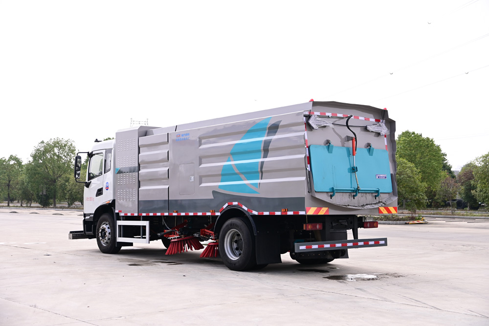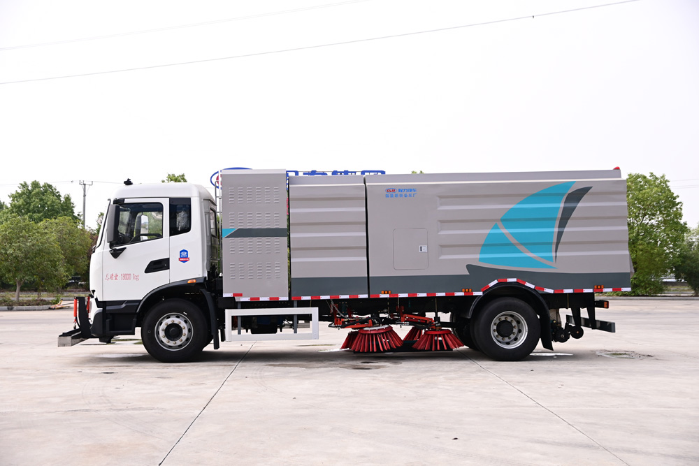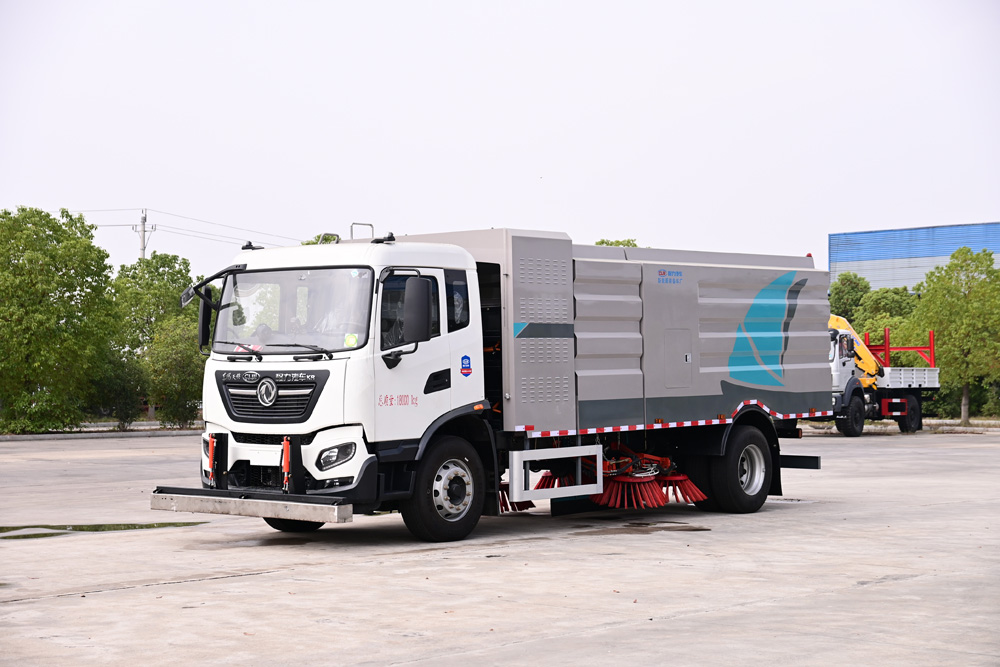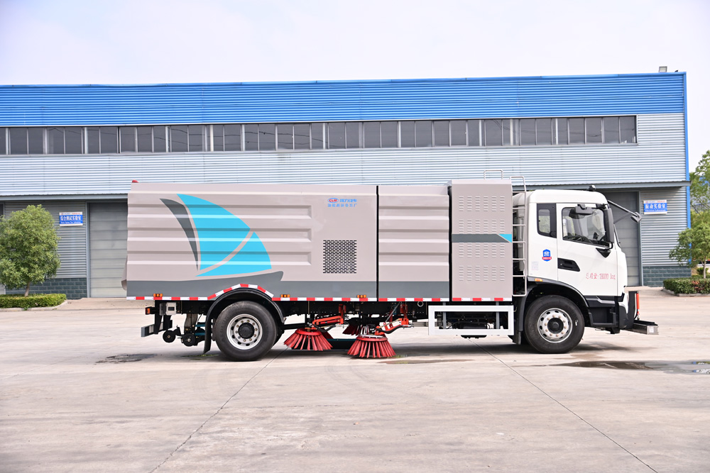 3、掃路車采用東風(fēng)純電動二類汽車底盤改裝,加裝風(fēng)機、清水箱、垃圾箱、左右立掃、掃盤降塵系統(tǒng)、液壓