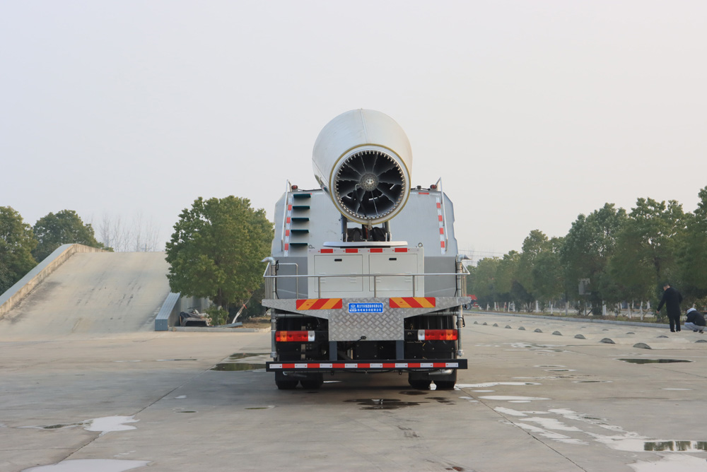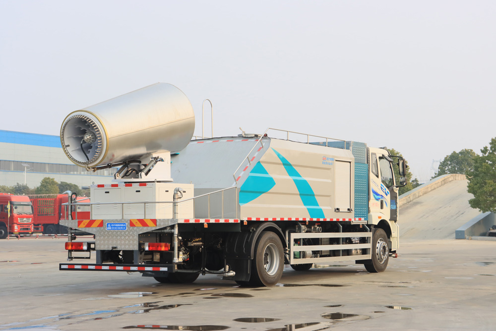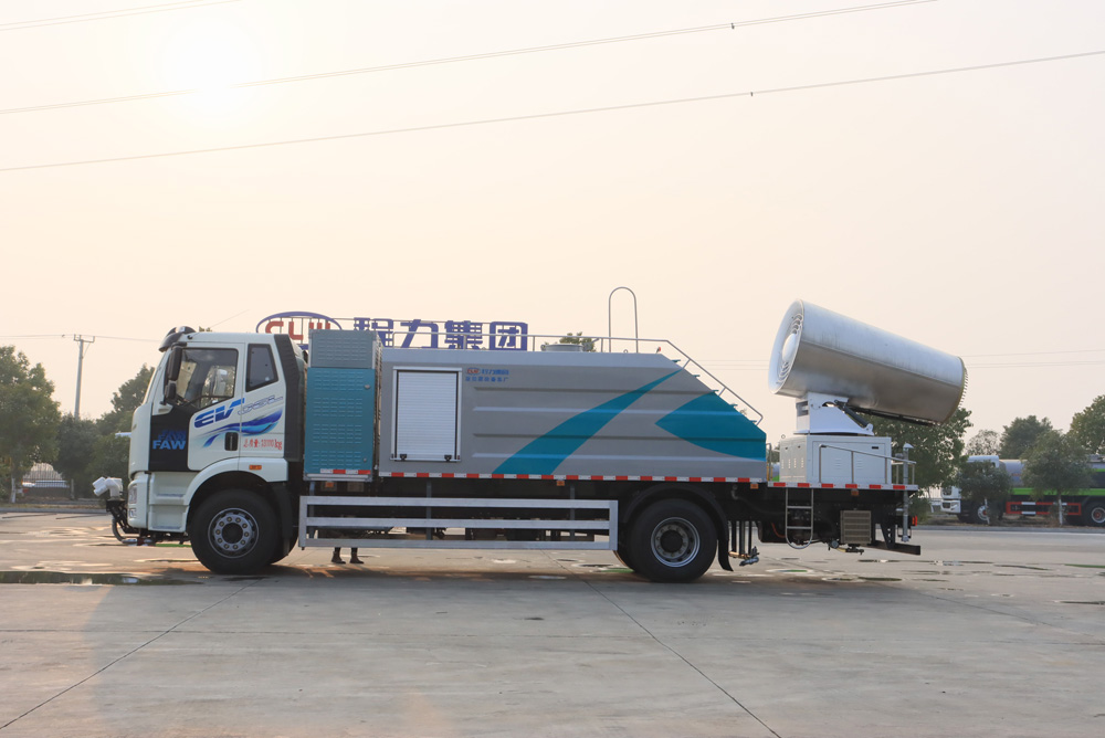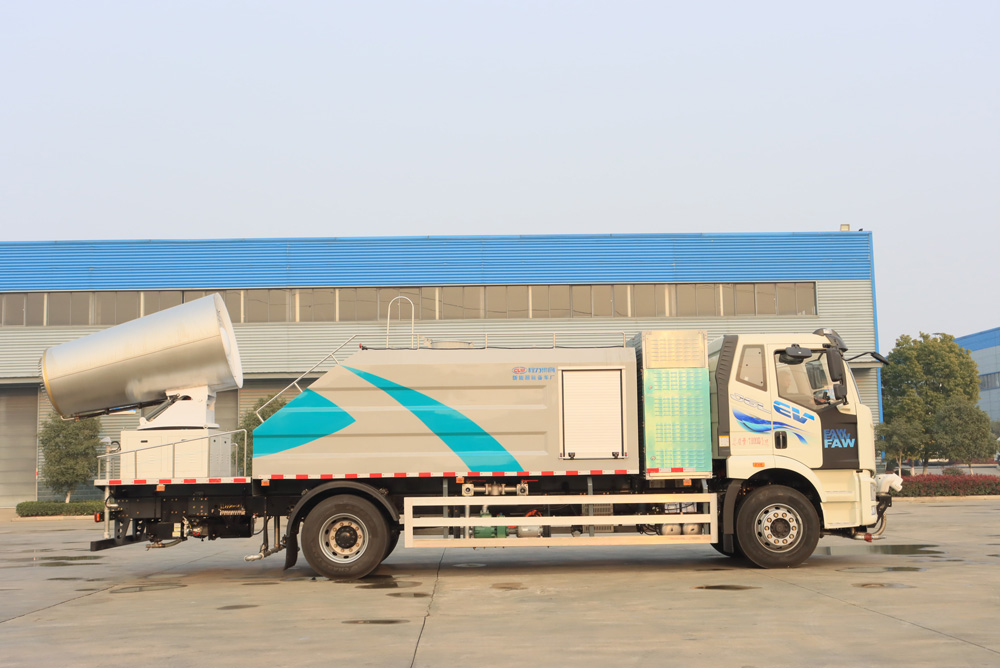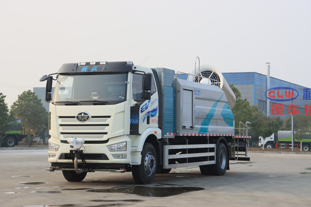 四、其他說明: 解放純電動抑塵車是在純電動二類底盤的基礎上,加裝低壓沖洗、灑水系統、霧炮機組,由機械、液壓(氣路)、電器三部分合為一體的專用灑水作業車。工作原理:采用自吸式雙級離心泵,效率高、灑水寬度大、水槍射程遠,低壓水泵由底盤變速器取力器通過傳動軸直接傳動。霧炮機組由底盤電池帶動霧炮風扇電機、不銹鋼多級離心泵,進行噴霧降塵工作。